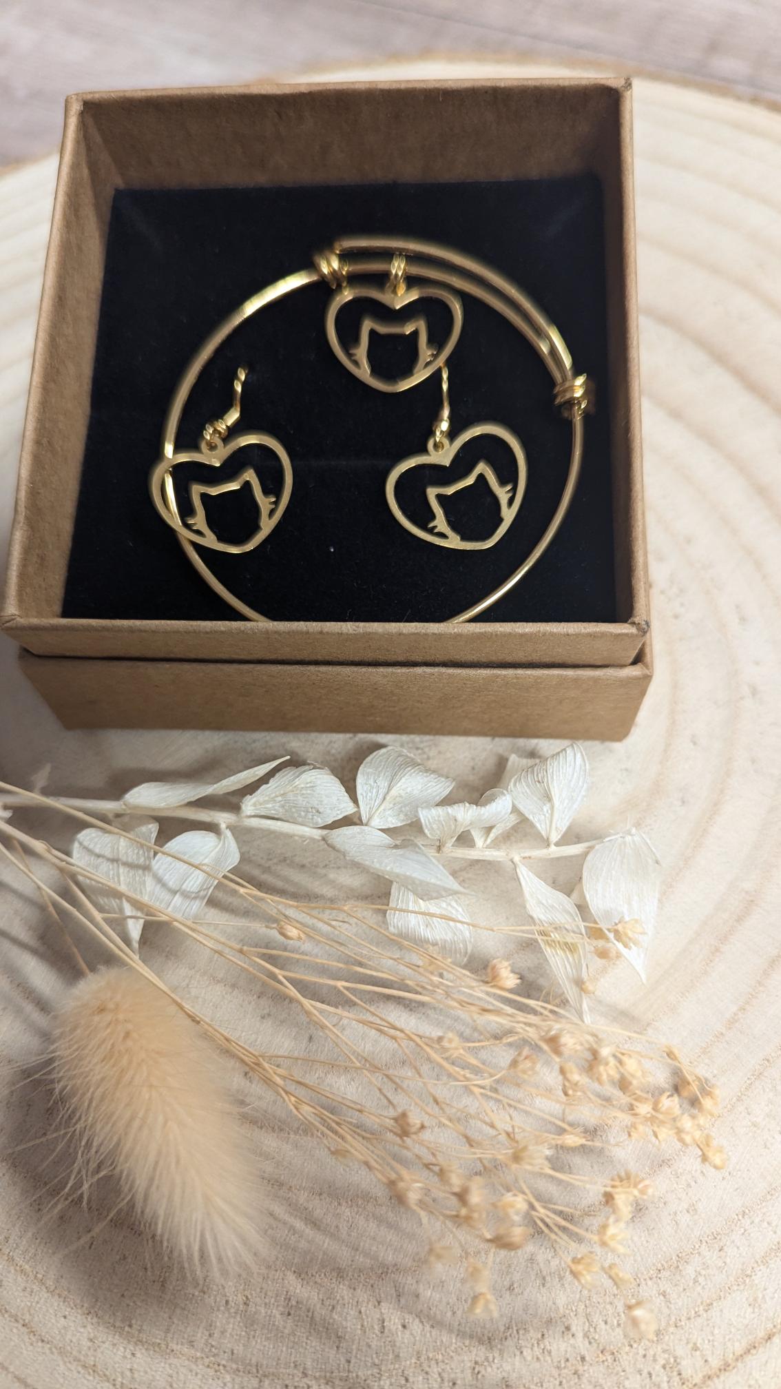 Coffret bijou acier doré pampille coeur chat