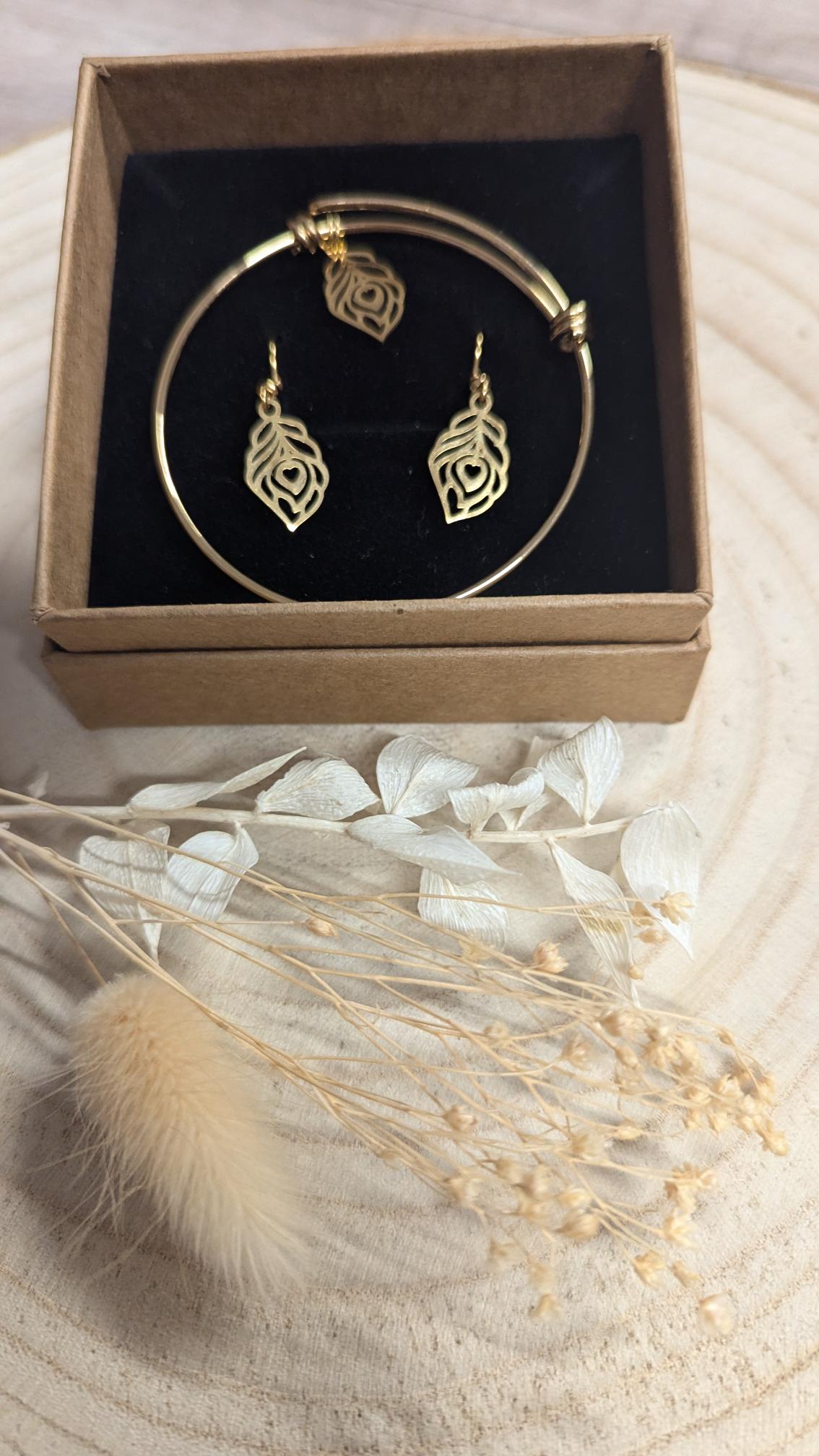 Coffret bijou acier doré pampille feuille